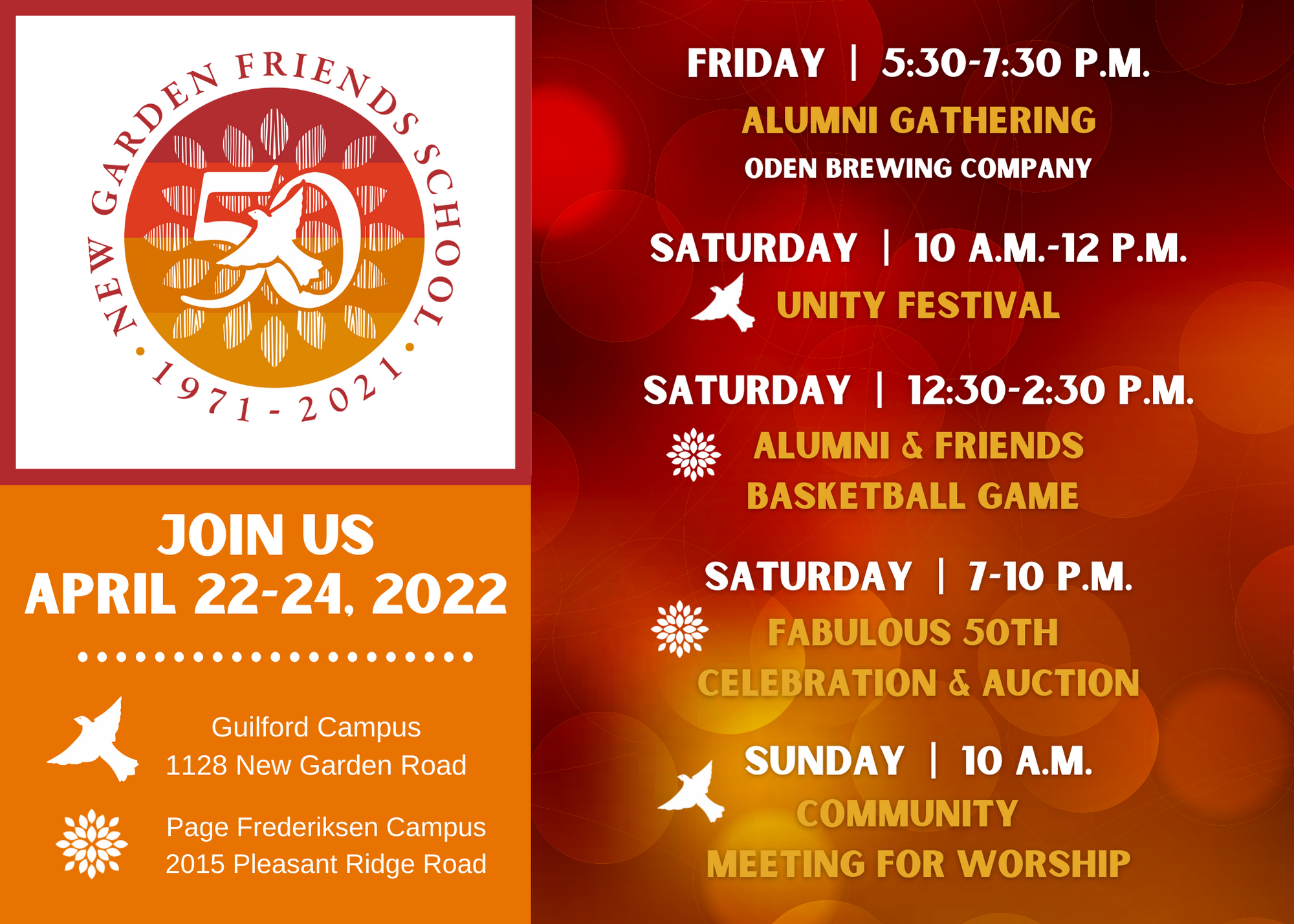 Come home for one of New Garden Friends School’s favorite events, taking place on the Guilford Campus at 1128 New Garden Road.